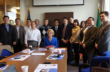華盛頓州州長Christine O. Gregoire 女士 會見了訪問團全體團員,并對團員們訪問華盛頓州表示了歡迎。華盛頓州商務廳官員Spencer Cohen 、Mark Calhoon 等向?qū)W員們介紹了華盛頓州的基本情況和有關(guān)法律、政策以及經(jīng)濟發(fā)展和貿(mào)易往來、新興產(chǎn)業(yè)的發(fā)展情況。