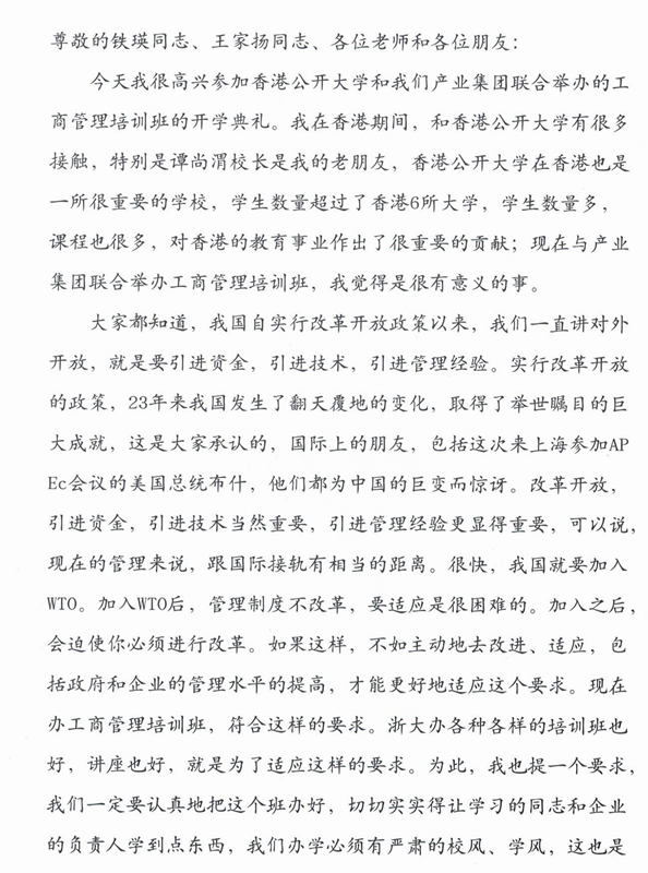 2001年10月28日,張浚生書記在我校與香港公開大學(xué)的國際高級工商管理研修班(MBA)開學(xué)典禮上的講話